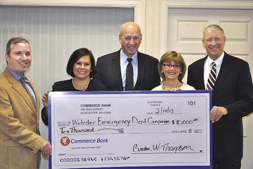 Commerce Bank in Webster donated $10,000 to Harrington HealthCare’s Webster emergency department rebuilding. Pictured, from left to right, are: Sean Mitchell, development director, Harrington HealthCare; Shereen Fahey, Webster branch manager, Commerce Bank; Edward H. Moore, president and CEO, Harrington HealthCare; Pamela Zouranjian Connor, site administrator, Harrington; and Brian W. Thompson, president and CEO of Commerce.