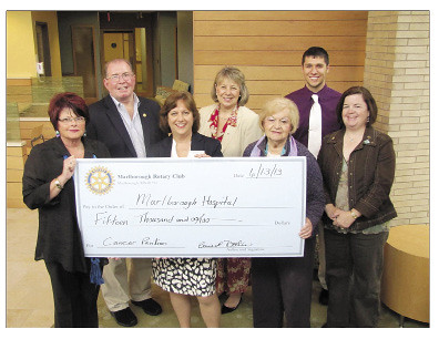 Marlborough Rotary Club donated $15,000 to the Marlborough Hospital Cancer Pavilion. Pictured, left to right, are: Candra Szymanski, interim president and CEO, Marlborough Hospital; David Walton, president-elect, Marlborough Rotary Club; Bonnie Doolin, president, Rotary; Elaine McDonald, immediate past president, Rotary; Marilyn Perry, director, Rotary; Monthe Kofos, Rotary Club president; and Peggy Sheldon, club secretary.