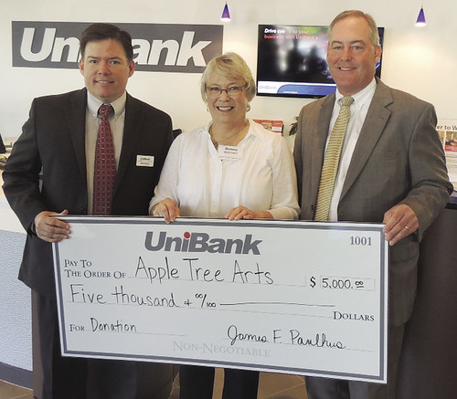 Whitinsville-based UniBank committed $50,000 in charitable donations and sponsorships, including $2,500 each to Grafton Food Bank and Tufts Cummings School of Veterinary Medicine, and $5,000 to Apple Tree Arts. Pictured, left to right, are: Robert Russo, Grafton branch manager, UniBank; Donna Blanchard, executive director, Apple Tree Arts; and James F. Paulhus, the bank’s president and CEO.