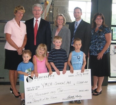 The Webster Five Foundation, a charitable organization founded by Webster Five Cents Savings Bank, recently announced it will donate $5,000 annually over a two-year period to the YMCA of Central Massachusetts. The funds will support the renovation of the Central Community branch and the Greendale Family branch in Worcester as well as the expansion of the Boroughs Family branch in Westborough. Pictured, from left to right, are: Kathryn Zingg Hunter, president and CEO of the YMCA of Central Massachusetts; Richard T. Leahy, president and CEO of Webster Five; Karen M. Kempskie-Aquino, vice president, Webster Five; Patrick T. Royce, branch manager for Webster Five Shrewsbury Branch; and Lori Bastien, executive director of the Boroughs Family Branch. PHOTO/COURTESY