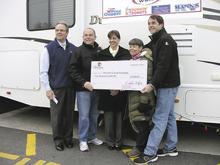 Worcester-based Fallon Community Health Plan donated $8,000 to Worcester County Food Bank live on 96.1 WSRS. Pictured, left to right, are: Pat Hughes, president and CEO, Fallon Community Health Plan; Paul Belsito, board member, Worcester County Food Bank; Christine Cassidy, vice president of corporate communications, FCHP; Jean McMurray, food bank director, and Greg Byrne of WSRS.