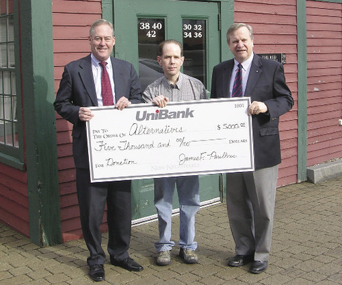 Whitinsville-based UniBank made a $5,000 donation to Alternatives Unlimited Inc. of Worcester, an agency that provides services to those with developmental disabilities. Pictured, left to right, are: James F. Paulhus, president and CEO, UniBank; Matt Albee, a resident at an Alternatives apartment at Whitin Mill; and Dennis H. Rice, executive director of Alternatives Unlimited.