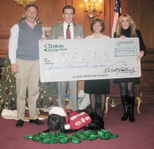 Officials from Clinton Savings Bank presented the NEADS organization - a program that trains assistance dogs-with a check for $5,100. The donation marks the success of the bank's three-month campaign dedicated to raising awareness and funds for the Canines for Combat, a veteran's program that connects service dogs with disabled soldiers. Pictured, from left to right, are: John Moon, the major gift officer for NEADS; Bob Paulhus, Clinton Saving's Bank president; Cindy Alden, vice president of branch administration and Ellen McGovern, vice president of marketing. PHOTO/COURTESY