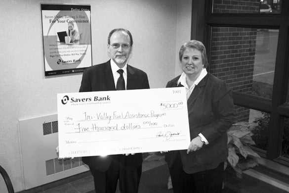 Savers Bank of Southbridge recently made a $5,000 donation to Tri-Valley Inc. to support fuel assistance relief for needy elderly residents. The donation was the first installment of an annual $10,000 donation to the Dudley-based nonprofit organization that annually helps more than 4,000 residents 60 years of age and older. Pictured, from left to right, are: Paul Jalbert, president and CEO of Savers Bank, and Marilyn L. Travinski, executive director of Tri-Valley Inc. PHOTO/COURTESY