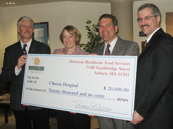 Following a recent $20,000 donation to Clinton Hospital, Morrison Healthcare Food Services of Atlanta became the latest member of the Clinton Hospital Partnership. Established in 2008, the partnership has raised almost $200,000 for the hospital's capital budget needs. Morrison Healthcare Food Services provides food services for the six UMass Memorial Health Care campuses, of which Clinton Hospital is a part. Pictured, from left to right, are: Steven Gadapee, food services director at Clinton Hospital; Sheila Daly, Clinton Hospital president and CEO; Tom Warren, regional vice president of Morrison Healthcare Food Services; and Rob Finelli, regional director of operations at Morrison Healthcare Food Services. PHOTO/COURTESY