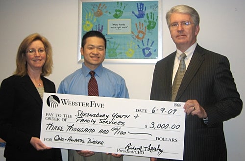 The Webster Five Foundation, a charitable organization founded by Webster Five Cents Savings Bank, recently donated $3,000 to Shrewsbury Youth and Family Services Inc. (SYFS). The funds raised will help SYFS to continue working with local organizations to provide counseling and education services to Shrewsbury families, including violence intervention and prevention programs, after-school programming and youth development and leadership. Pictured, from left to right, are: Karen Kempskie-Aquino, vice president of Webster Five Cents Savings Bank; Jeffrey Chin, executive director of Shrewsbury Youth & Family Services Inc. and Richard T. Leahy, president and CEO of Webster Five Cents Savings Bank.