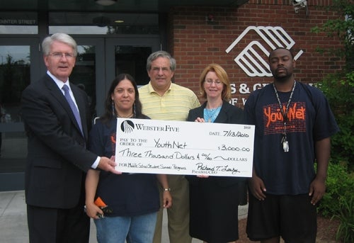 The Webster Five Foundation recently donated $3,000 to YouthNet, a program that offers summer programs for middle-school-aged students in the Worcester area. The money will support activities like arts and crafts, basketball, games, movies and music. The foundation is the charitable arm of Webster Five Cents Savings Bank. Pictured, from left to right: Richard T. Leahy, president and CEO of Webster Five Cents Savings Bank; Bonnie Pulver, program coordinator for YouthNet; Tony Poti, YouthNet administrator; Karen Kempskie-Aquino, vice president of the bank and Cyrus Alexander, assistant team leader for YouthNet. PHOTO/COURTESY