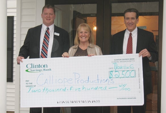 Clinton Savings Bank recently gave a boost to Calliope Productions, a theater company in Boylston. The money, donated by the bank's charitable foundation, will help the theater group upgrade its facilities. Pictured, from left to right, are: Brendan Gallagher, manager of the Boylston branch of Clinton Savings; Janice Fuller, Calliope board member and treasurer and Bank President Robert Paulhus Jr. PHOTO/COURTESY