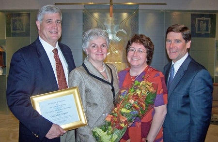 Attorney Gail Allen of Leominster was one of six recipients of the 12th Annual White Mass Award. The White Mass, held by the Diocese of Worcester, the Saint Luke Society and the Guild of our Land of Providence, honors those who show commendable work in promoting health care for the disadvantaged. Pictured, from left to right, are: Robert Allen, husband of Gail Allen; Gail Allen; Cathy Pimley, chaplain at HealthAlliance Hospital, and Patrick Muldoon, president and CEO of HealthAlliance Hospital. PHOTO/COURTESY