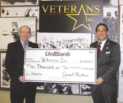 Whitinsville-based UniBank donated $5,000 to Veterans Inc. of Worcester. Pictured, from left to right, are: William M. Mahoney, senior vice president and CFO, UniBank; and Vincent J. Perrone, president and CEO of Veterans Inc.