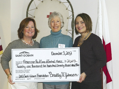 Saint-Gobain donated $21,673 to the American Red Cross of Central Massachusetts. Pictured, from left to right, are: Kathleen Quinty, director of human resources, Saint-Gobain Abrasives Sales & Marketing; Lisa Piehler, regional CEO, American Red Cross of Central Massachusetts; and Lauren Petit, manager of communications and community relations, Saint-Gobain Abrasives.
