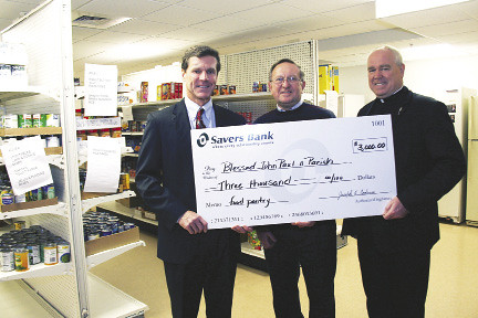 Southbridge-based Savers Bank donated $3,000 to the Senior Supplement food pantry program at Blessed John Paul II Parish in Southbridge. Pictured, from left to right, are: Joseph Coderre, president and CEO, Savers Bank; William Mason, fundraising director, Blessed John Paul II Parish; and Rev. Peter Joyce, pastor, Blessed John Paul II.