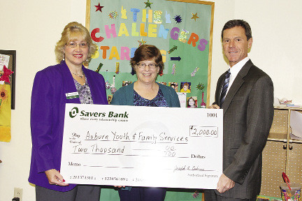 Southbridge-based Savers Bank donated $2,000 to Auburn Youth & Family Services. Pictured, left to right, are: Lynne Ellis, Auburn branch manager, Savers Bank; Sally D’Arcangelo, executive director, Auburn Youth & Family Services, and Joseph Coderre, CEO and president of Savers.