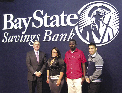 Worcester-based Bay State Savings Bank awarded nine $500 scholarships and one four-year, $4,000 scholarship to 10 area high school seniors. Pictured, from left to right, are: Peter B. Alden, Bay State Savings Bank president and CEO; Julieth Betancourth, who is attending Quinsigamond Community College this fall; Alexander Karanja, who is attending UMass in Boston, and Hector Rivas, who will attend Worcester Polytechnic Institute.