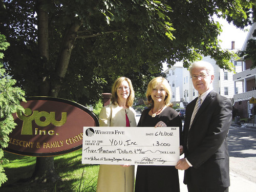 Webster Five pledged $3,000 to Worcester-based Youth Opportunities Upheld Inc., a child welfare and behavioral health non-profit. Funding will support, in part, implementation of an electronic health records system. Pictured, from left to right, are: Karen Kempskie-Aquino, vice president, Webster Five; Beth Folcarelli, CEO, Y.O.U. Inc.; and Richard Leahy, CEO of Webster Five.