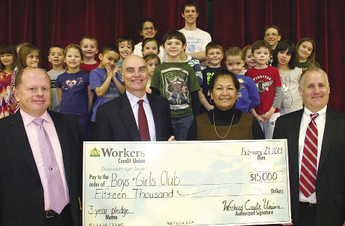 Leominster-based Workers’ Credit Union donated $15,000 over three years to the Boys & Girls Club of Fitchburg and Leominster. The club got a major renovation, including space to design and build robotics. Pictured, left to right, are: Shawn Linehan, Workers’ Credit Union; Doug Petersen, also of the credit union; Donata Martin, Boys & Girls Club of Fitchburg and Leominster; and Jim Adams of the club; with kids.