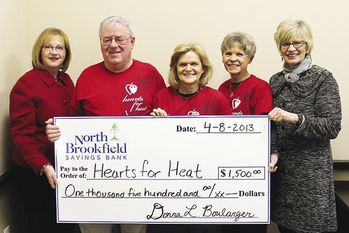 North Brookfield Savings Bank donated $1,500 to Hearts for Heat, which provides gas, oil and wood to town residents in need. Pictured, left to right, are: Donna Belanger, president and CEO, North Brookfield Savings Bank; Tom and Sue Lewandowski and Ellen Smith of the North Brookfield chapter of Hearts for Heat; and Betsy Cuddy, bank trustee.