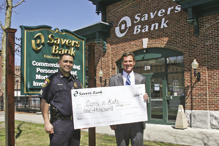 Southbridge-based Savers Bank donated $1,000 to the Southbridge Police Department’s Cops ‘N’ Kids program, which aims to help kids understand law enforcement in a positive way. Pictured, from left to right, are: Sgt. Jose Dingui, Southbridge Police Department; and Joseph Coderre, president and CEO, Savers Bank.
