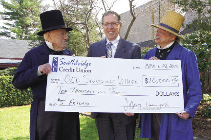 Southbridge Credit Union donated $10,000 to fund three $5 Fridays at Old Sturbridge Village. Pictured, left to right, are: Thruse Hammer, interpreter, Old Sturbridge Village; Jeff Davenport, president, Southbridge Credit Union; and Will Contino, interpreter at OSV.