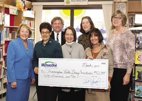 Framingham-based Mutual One Bank pledged $50,000 over three years to help build the Christa McAuliffe Branch Library in Framingham, awarding an initial $20,000. Pictured, from left to right, are: Susan Acton, MutualOne Charitable Foundation trustee; Ruth Winnet, president, Framingham Public Library Foundation; Mark Contois, library director; Nancy Gentile, Christa McAuliffe Library branch manager; Elizabeth Fiideler, library board member; Rachel Stewart, administrative director, Mutual One Charitable Foundation; and Jo-Anne Thompson, library board member.