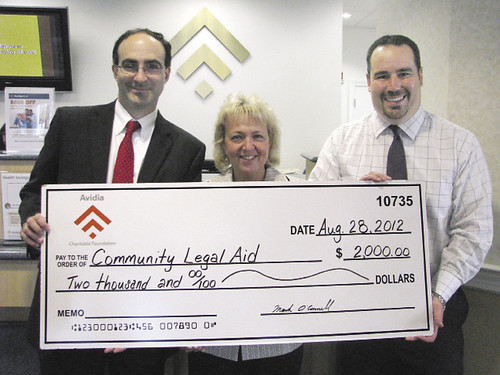 Hudson-based Avidia Bank donated $2,000 to Community Legal Aid of Worcester. Pictured, from left to right, are: Jonathan L. Mannina, executive director, Community Legal Aid; Karen Smith, Leominster branch, Avidia Bank; and Todd Wood, bank assistant branch manager.