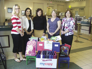 Southbridge Savings Bank collected school supplies for children serviced through Catholic Charities. Pictured, left to right, are: Meagan Rice, financial services representative at Southbridge Savings Bank; Tania Figueroa, the bank’s assistant branch manager; Lynne Anctil, bank human resources assistant; Lisa Genest, area administrator, Catholic Charities; and Bonnie Losavio, the bank’s human resources manager.
