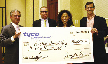 Westminster-based SimplexGrinnell, a Tyco business that specializes in fire and safety items, donated $30,000 to Aloha United Way in Honolulu, Hawaii, to spread Youth Venture, a leadership development program. Pictured, from left to right, are: Dave Baer, vice president of marketing, SimplexGrinnell; Chris Woodcock, director of marketing and communications, SimplexGrinnell; Pamela Maeda, vice president of fundraising, Aloha United Way; and Bob Chauvin, president, SimplexGrinnell.