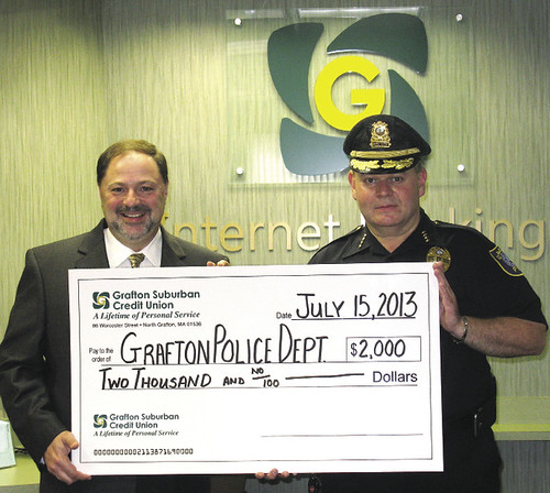Grafton Suburban Credit Union donated $2,000 to the Grafton Police Department to support its eighth annual National Night Out Block Party on Aug. 6. Pictured, from left to right, are: Lloyd L. Hamm Jr., president and CEO; Grafton Suburban Credit Union; and Norman A. Crepeau Jr., police chief, Grafton.