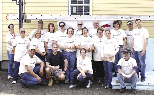 Employees of Travelers Insurance, with offices in Westborough, participated in building a home for the MetroWest/Greater Worcester Chapter Habitat for Humanity. Pictured: Travelers employees and agents at the build site at Plantation Street in Worcester.