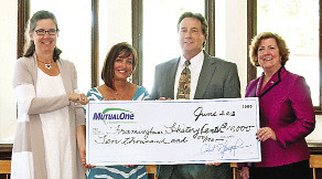 Framingham-based MutualOne Bank donated $10,000 toward window restoration at the historic Edgell Memorial Library. Pictured, left to right, are: Annie Murphy, executive director, Framingham History Center; Rachel Stewart, administrative director, MutualOne Charitable Foundation; Mark Haranas, president, MutualOne Bank; and Nancy Devine, vice president, MutualOne.