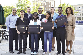 Worcester computer services firm Domitek donated five laptops to Worcester Public School students in Grades 7 and 8 who were winners in the firm’s essay contest. Winners, pictured left to right, are: Osamah Mandawi, Princilla Minkah, Yeni Ortega, and Yaw Amponsah. Not pictured: Anh Nguyet Phan. Back row, left to right: Benito Vega, Bryan Nicholson, Libis Bueno, Michelle Buchanan, and Sarai Rivera.