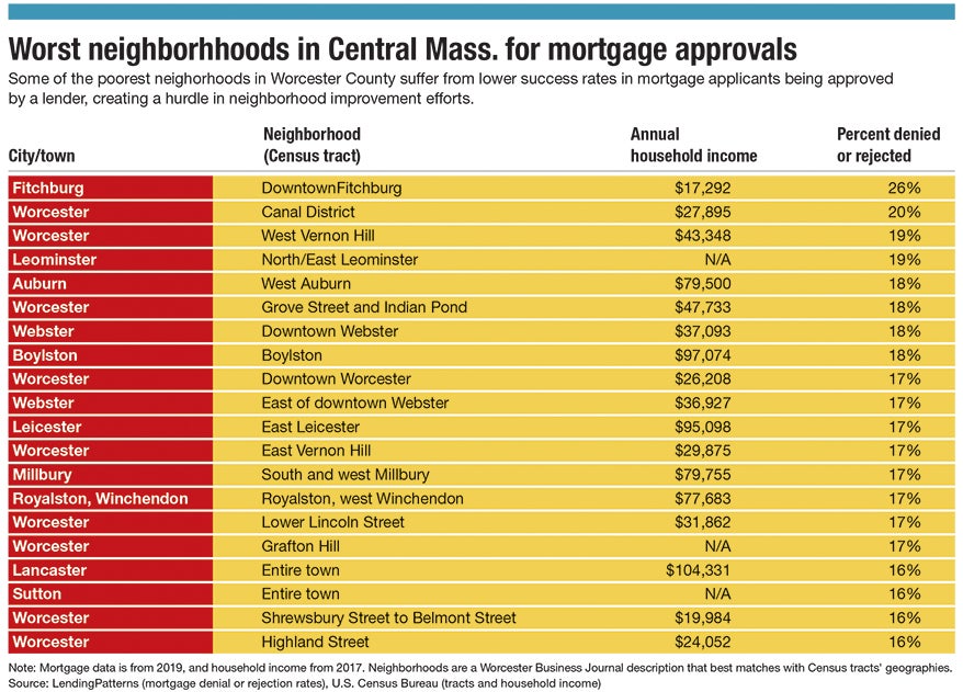 It only compounds the problem when residents looking to buy a home downtown are the least likely to be able to be approved for a mortgage of any neighborhood in Worcester County. That finding, part of a joint five-month investigation by the Worcester Business Journal and Worcester Regional Research Bureau into racial discrimination in mortgage lending in Central Massachusetts, highlights how persistent problems can be in improving some of the region’s most racially diverse and worst-off neighborhoods economically.