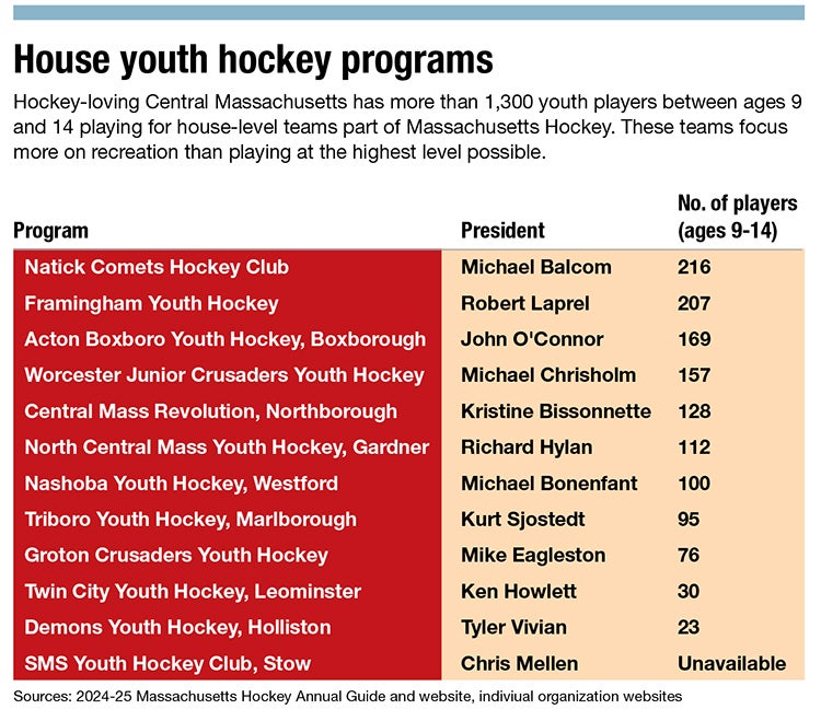 Central Massachusetts is home to more than 1,300 youth hockey players from ages 9 to 14, who play for what’s known as house teams, according to stats from state-level governing body Mass Hockey.