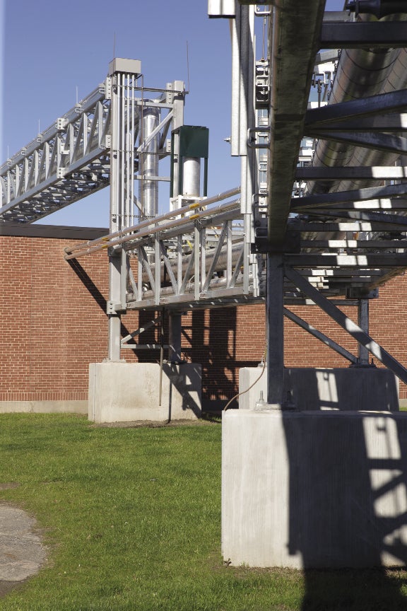 Sitting on the benches at the park, there’s an ominous feeling. A pair of smokestacks rise out of a few trees between the park and the factory on the other side. On one of them the word NORTON spelled down it, a relic of the previous company started in this space 137 years ago. Behind the fields is the main campus in Worcester for the Paris-based and multinational manufacturing company Saint-Gobain, which purchased the Norton Co. in 1990. The smokestacks belong to its old power plant, which served electricity to the campus for more than 70 years, but since Sept. 20, a new building and new system has been providing electricity and heat: the powerhouse, a 4.7-megawatt natural gas powered turbine.