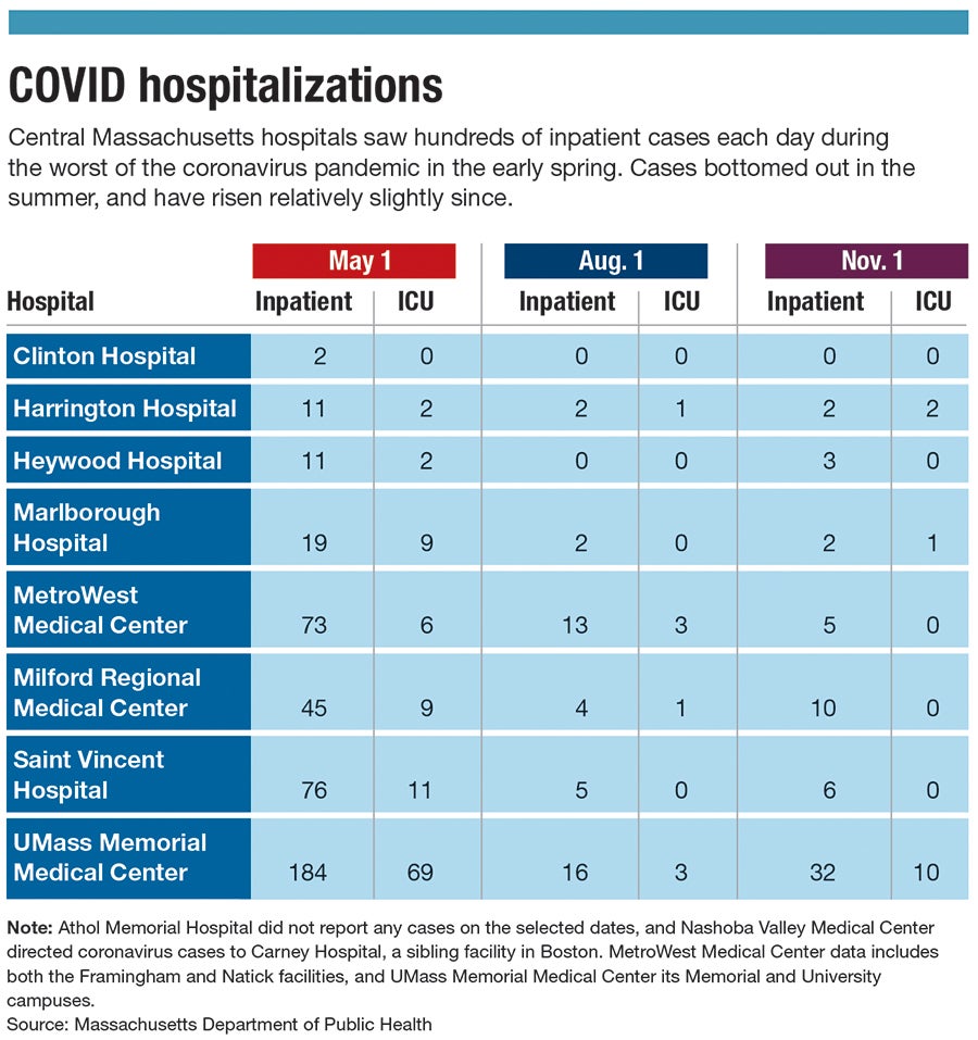 When the coronavirus pandemic peaked in Central Massachusetts in the early spring, hundreds of virus patients were in area hospitals, and dozens were in intensive care – so many that some hospitals had to repurpose ICU wings to make sure they had enough space.