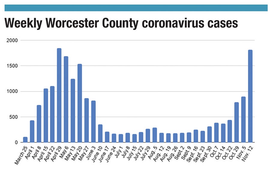 In just a two-week stretch – the first week of November to the second – cases roughly doubled in the city of Worcester, across Worcester County and in Massachusetts. New daily cases nationally surpassed 100,000 for the first time on Nov. 4, and they’ve topped 150,000 a day on many days since then.