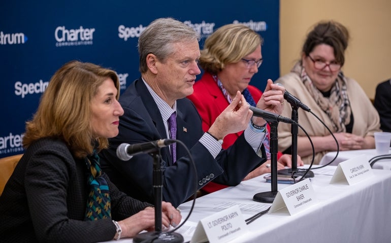 Gov. Charlie Baker and Lt. Gov. Karyn Polito visited the town Thursday with town officials and executives from Charter Communications to mark the completion of a new broadband network. A roundtable discussion included testimony from small businessowners about the benefits of getting high-speed internet connections.
