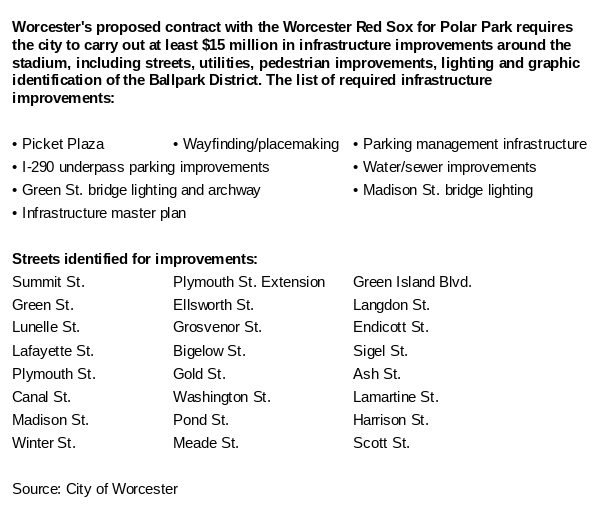 A proposed lease agreement between the Worcester Red Sox and the City of Worcester commits the city to at least $15 million in infrastructure improvements around Polar Park in addition to the ballpark’s roughly $157-million cost.