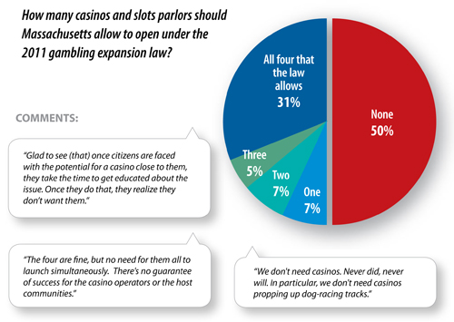 As last month’s rejection in Milford of a proposed resort casino showed, the expansion of gambling in Massachusetts is proving to be a tough sell in many Bay State communities. That was borne out in our Flash Poll for the week of Nov. 25, in which half of our respondents said the state should not allow any to be built.