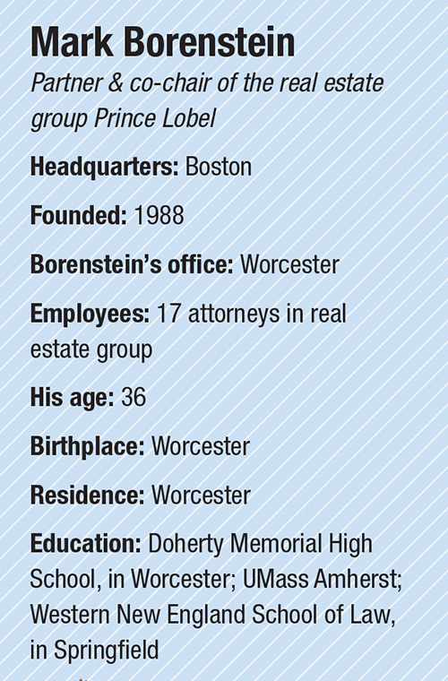 Born and raised in Worcester, Mark Borenstein got his start as an attorney in 2014 at the law firm Seder & Chandler.By 2018, he joined the Worcester law firm Bowditch & Dewey, becoming a partner in its real estate practice in 2023. The following year, he was part of the large group of Bowditch attorneys who left to start the Worcester office of Boston law firm Prince Lobel. At the start of this year, he was named the co-chair of Prince Lobel’s real estate group. He represents developers as they navigate the process to get their projects approved, financed, and built.
