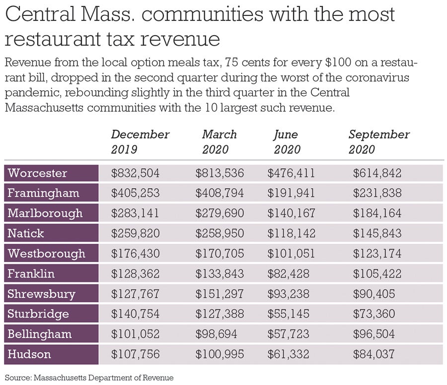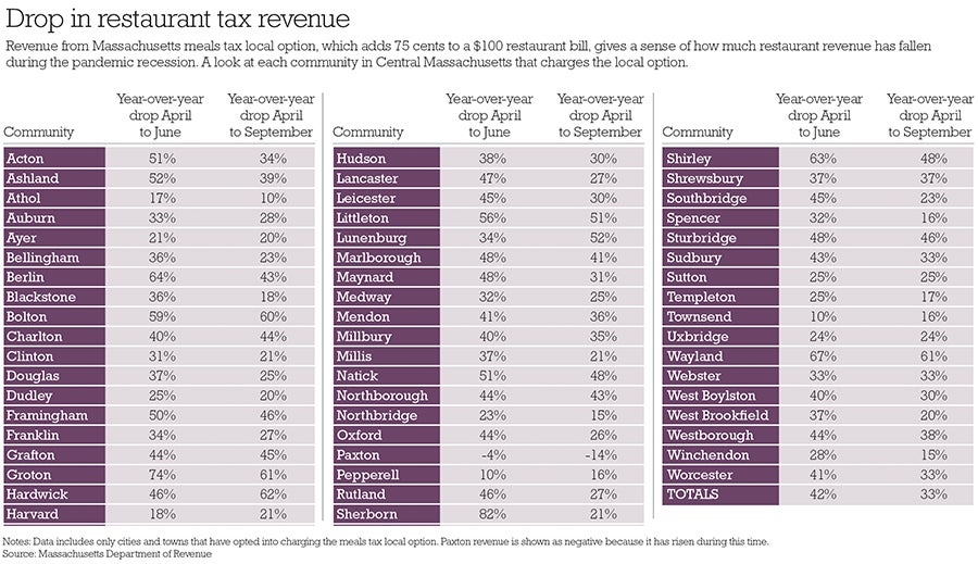Across Central Massachusetts, revenue from taxes on restaurant bills plunged 42% in the three months spanning April to June, which covered what was largely the worst of the early phase of the pandemic locally, as well as the tightest government restrictions on business operations. In the six months ending in September, that revenue dropped 33%.