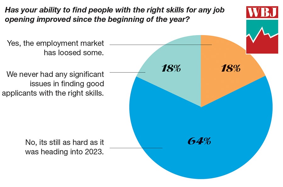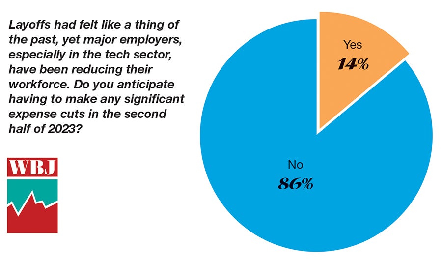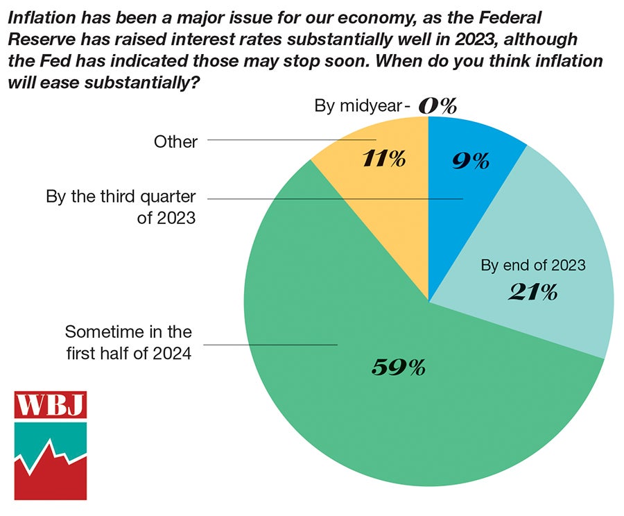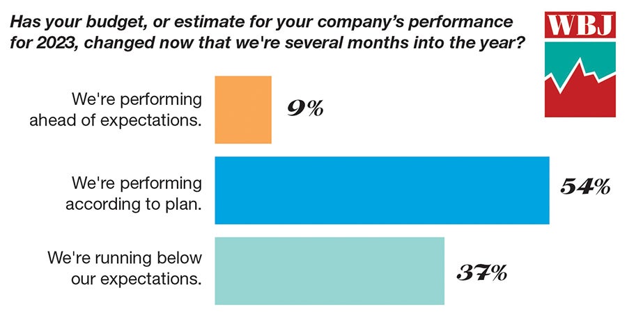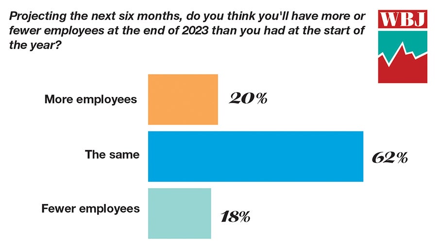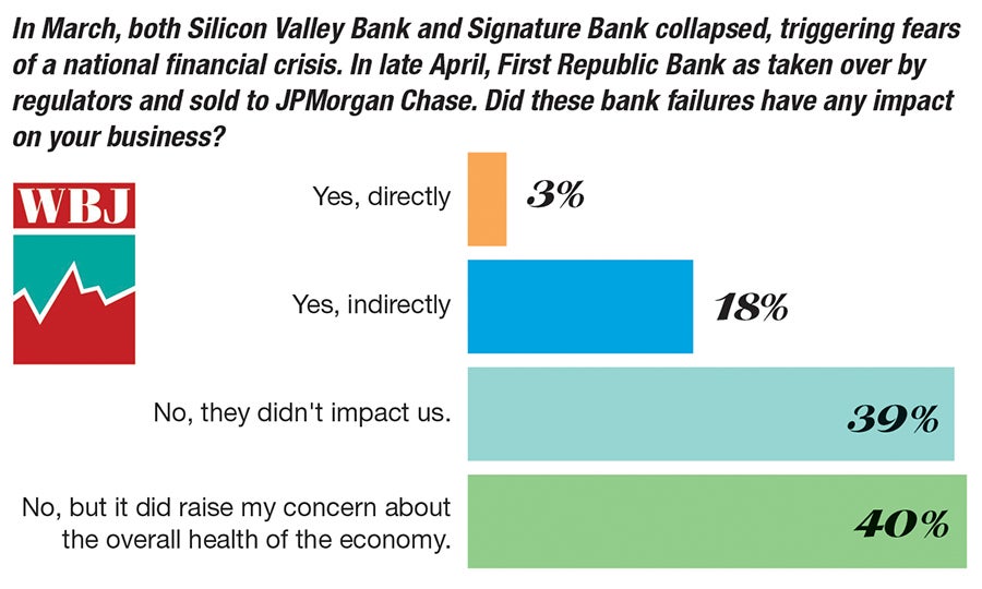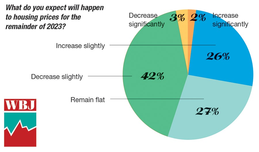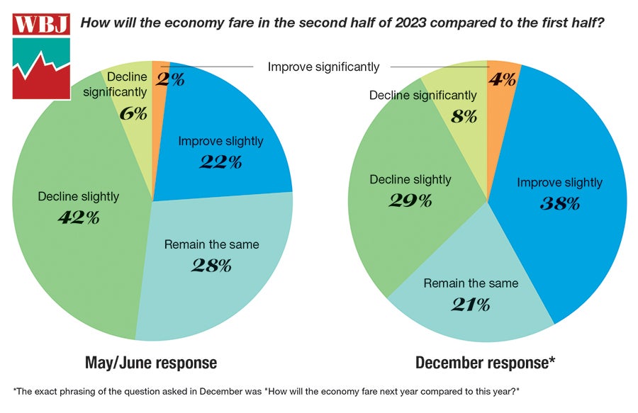 Because of the number of large economic events that happened to start 2023 – bank failures, residential real estate hitting a hard stop, the still-looming recession amid a strong labor market in a growing economy – WBJ decided to conduct a Midyear Economic Survey of its readers to update their thoughts about 2023. This time, nearly 50% of the 115 respondents in the May/June survey said the economy would either decline slightly or decline significantly by the end of the year.