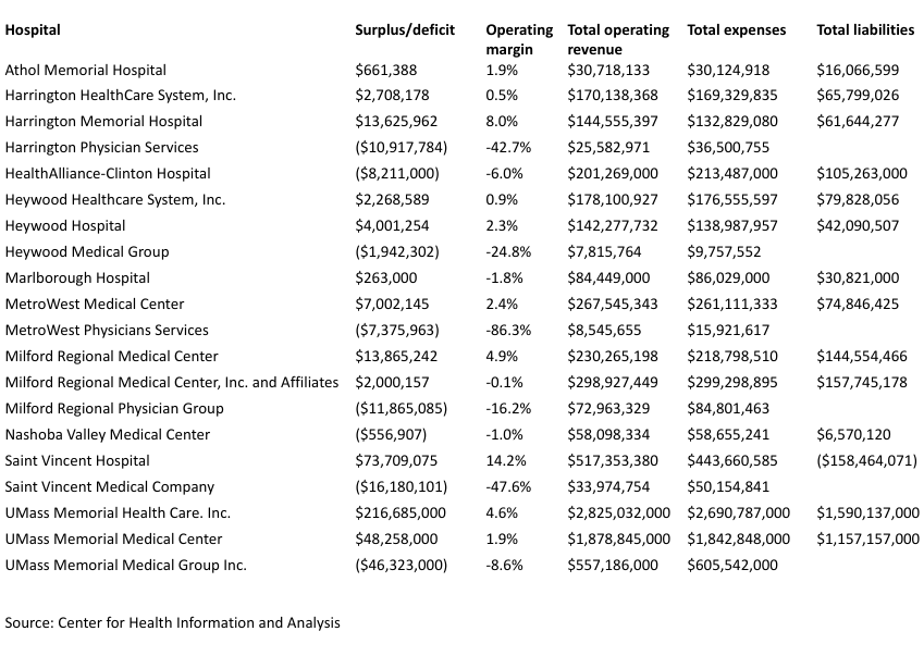 Saint Vincent Hospital in Worcester, for example, ended last fiscal year with a nearly $74-million net surplus, good for a 14.2% profit margin last year. Worcester-based UMass Memorial Health Care had a $217-million revenue surplus, a 4.6% positive margin.