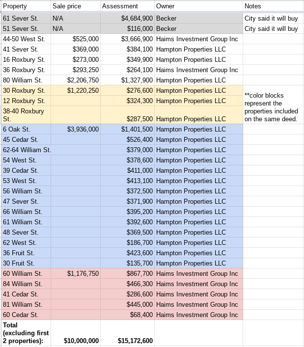 The purchases were broken up into several deeds, sold to Hampton Properties, LLC and Haims Investment Group Inc., both of which are registered to Hampton Properties on Elm Street in Worcester.