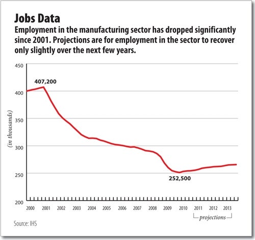 In 2001, Massachusetts went from 407,000 people employed in manufacturing to 370,000, and the sector continued declining. By the third quarter of 2006, the sector employed fewer than 300,000 and today it employs about 250,000, according to IHS.