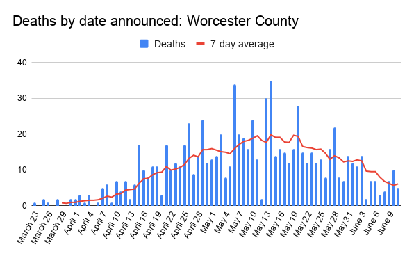 Fatalities in Worcester County increased by five adding to the 849 recorded since the pandemic began. Statewide, probable and confirmed coronavirus deaths increased by 38 contributing to the 7,492 total.