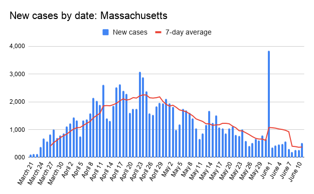 The new cases in the county bring the total to 11,885, and is a larger increase compared to Wednesday’s 17 new cases. Throughout Massachusetts, there were 519 confirmed and probable cases on Thursday bringing the total to 104,675.