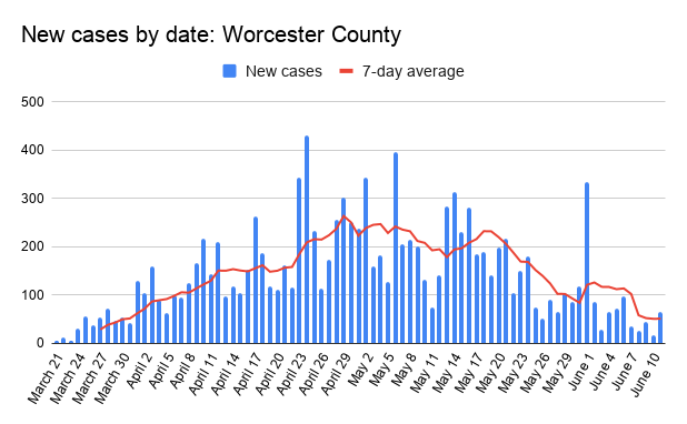 Worcester County reported 65 new coronavirus cases Thursday, which is an uptick from Wednesday’s low numbers, according to the Massachusetts Department of Public Health.