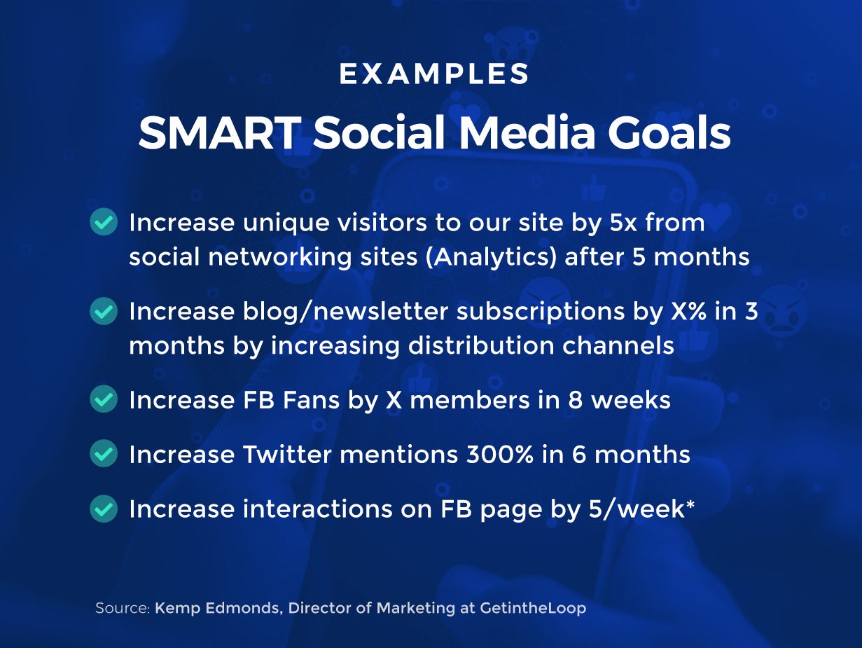 Here’s an example of social media goals from Kemp Edmonds, director of marketing at GetintheLoop: