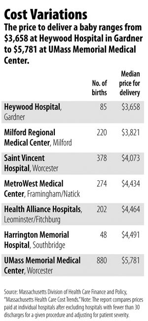 Traditional, non-C-section delivery of a baby was the only procedure common enough to offer a comparison between the largest and smallest Central Massachusetts hospitals, and the difference is striking. At Heywood, the median price for a delivery is $3,658. At Milford, it’s $3,821. At UMass Memorial Medical Center, the most expensive hospital in the area, it’s $5,781.